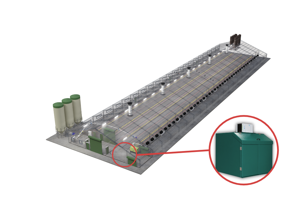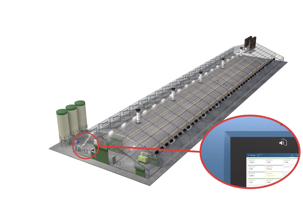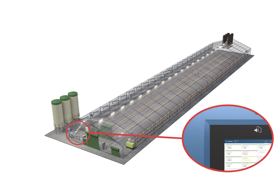 Effiziente Kontrolle und Überwachung sind entscheidend. Unsere Systeme registrieren Futter- und Wasserverbrauch, Luftfeuchtigkeit, Temperatur und Tiergewicht und stellen alle Daten in der Software “FarmOnline” zentral dar. Der Produktionscomputer steuert Beleuchtung, Futter und mehr, um das Stallklima und die Produktionsbedingungen kontinuierlich zu verbessern.