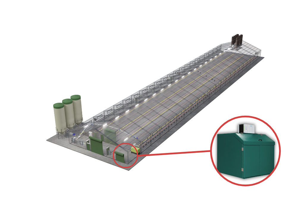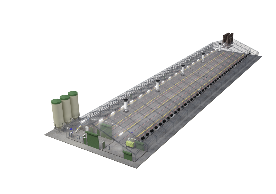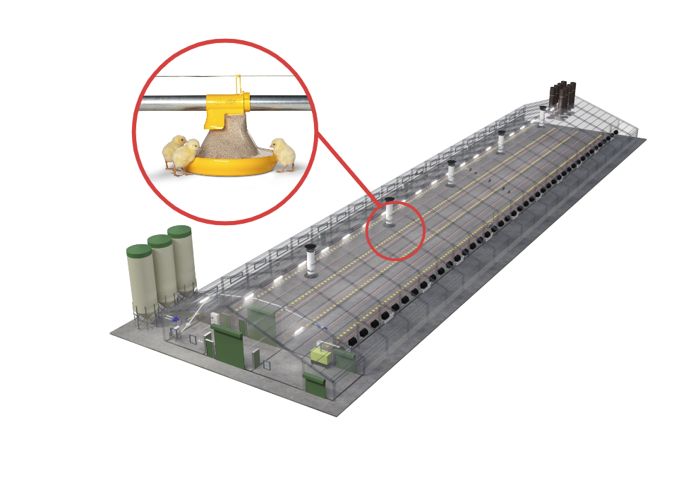 Unsere Fütterungsanlagen sind entscheidend für eine erfolgreiche Broilermast. Landmeco’s Futterschale bietet dank patentierter Lösungen optimale Futterverfügbarkeit. Die Futterlinien sind mithilfe elektrischer Hebemotoren höhenverstellbar. Hochwertige Silos gewährleisten hygienische Lagerung, und eine Futterwaage erfasst den Futterverbrauch präzise.