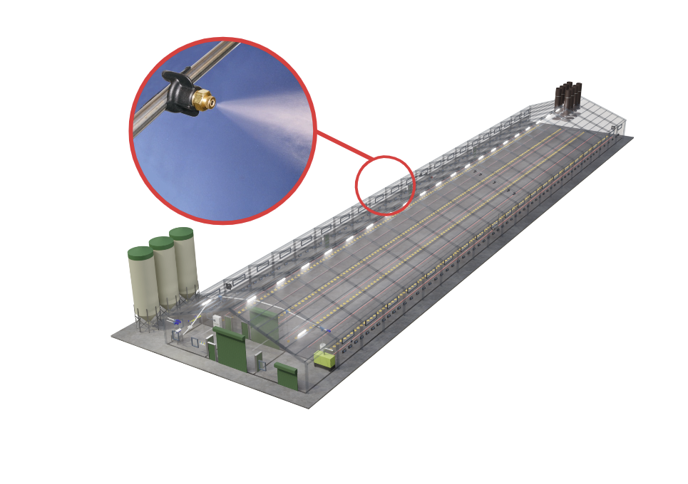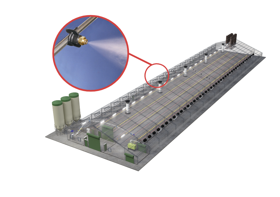 Hochdruckkühlung sprüht feinstes Wasser in die warme Stallluft, kühlt sie durch Verdunstung ab und senkt die Temperatur deutlich. Das System, bestehend aus einer Hochdruckpumpe und FlexClamp-Düsen, erzeugt feinen Nebel und kann an der Seitenwand oder Decke montiert werden.