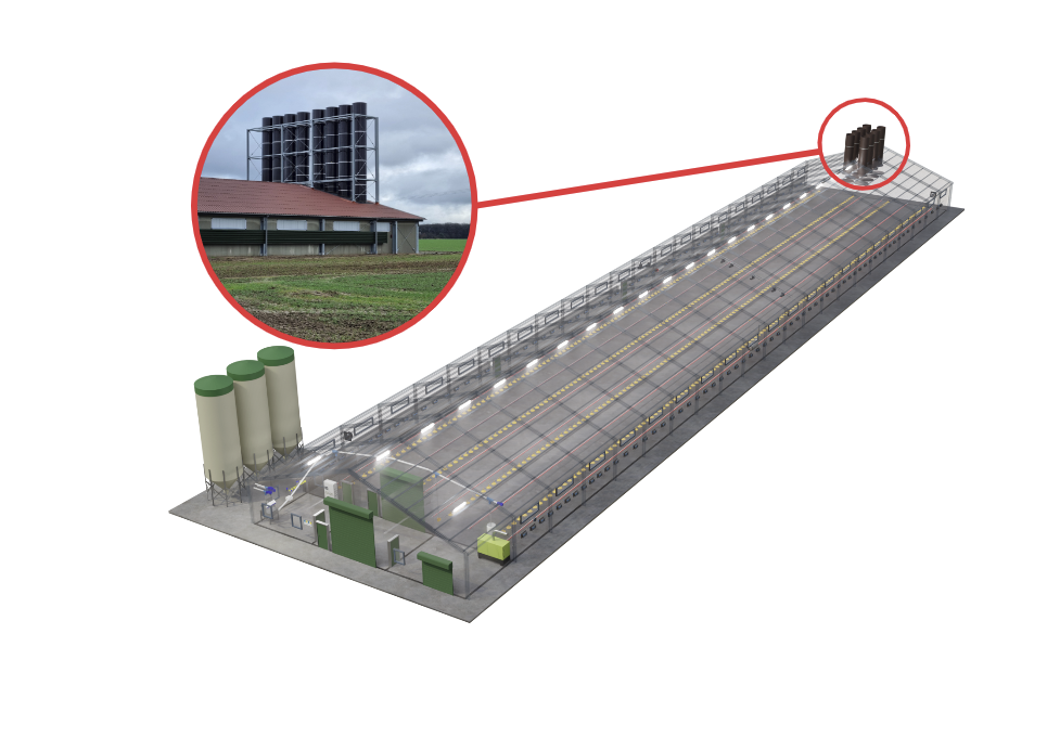 Effiziente Abluftanlagen sind entscheidend für das Wohlbefinden und die Gesundheit der Tiere. Unsere Systeme entfernen kontinuierlich verbrauchte Luft, Feuchtigkeit, Staub und schädliche Gase. Sie bieten hohe Leistungsfähigkeit und Zuverlässigkeit, bestehen aus langlebigen Materialien und passen die Abluftmenge präzise an, um ein optimales Stallklima zu gewährleisten.