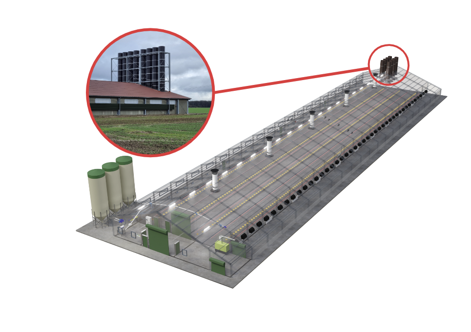 Wir arbeiten zusammen mit zertifizierten Herstellern von Abluftreinigungsanlagen. Die Abluftreinigungsanlage ist ein chemisch arbeitender Abluftwäscher zur Abscheidung von Staub und Ammoniak aus eingestreuten Hähnchenmaststallungen mit Schwermastverfahren.