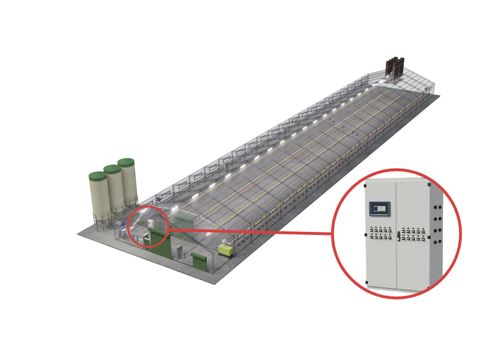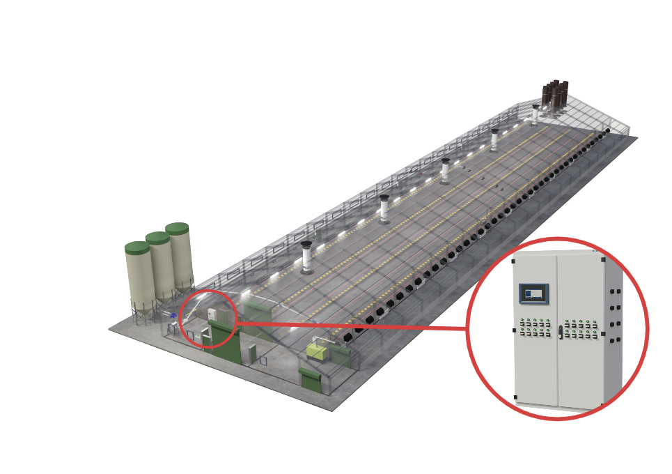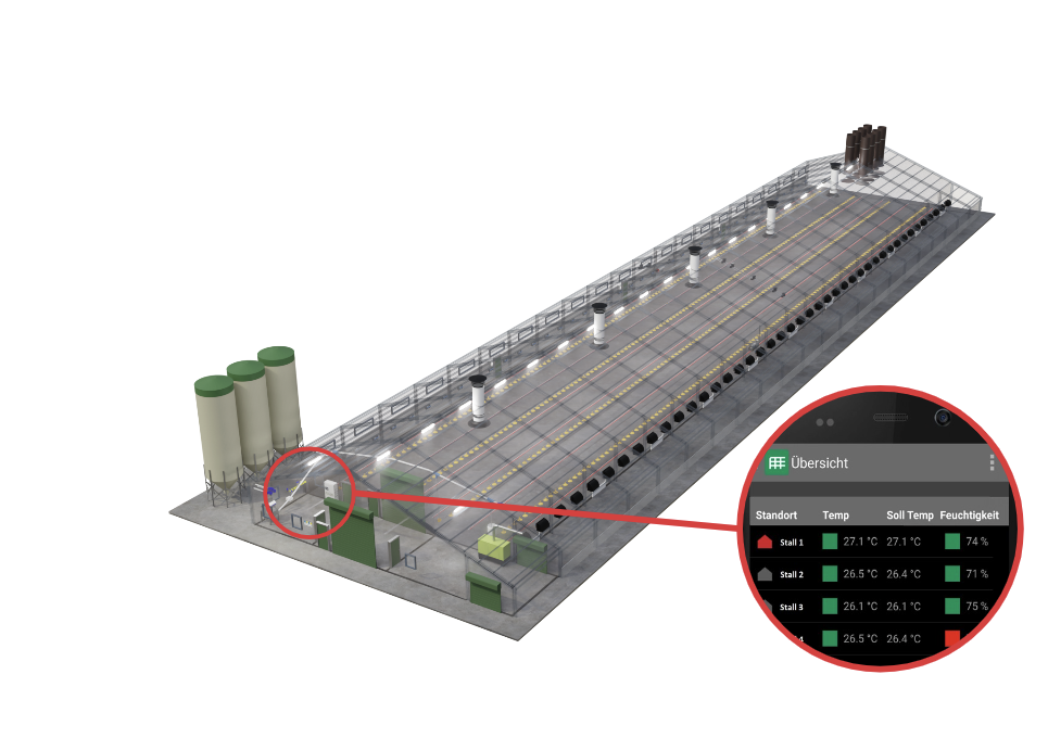 Effiziente Kontrolle und Überwachung sind entscheidend. Unsere Systeme registrieren Futter- und Wasserverbrauch, Luftfeuchtigkeit, Temperatur und Tiergewicht und stellen alle Daten in der Software “FarmOnline” zentral dar. Der Produktionscomputer steuert Beleuchtung, Futter und mehr, um das Stallklima und die Produktionsbedingungen kontinuierlich zu verbessern.