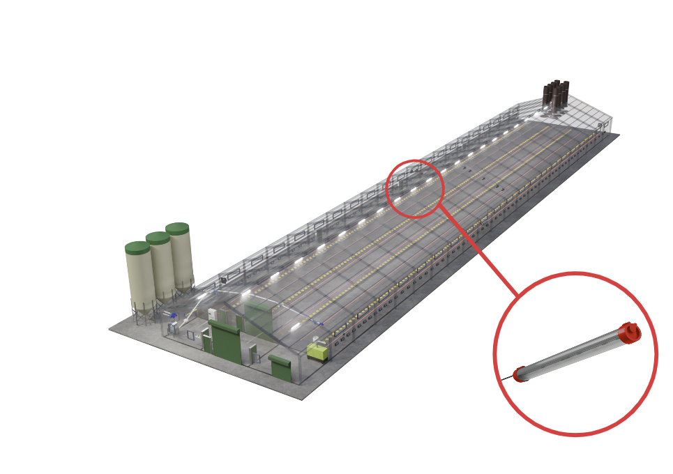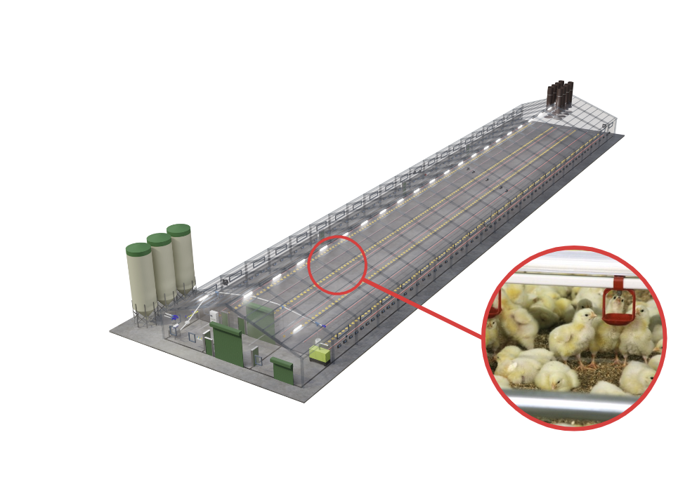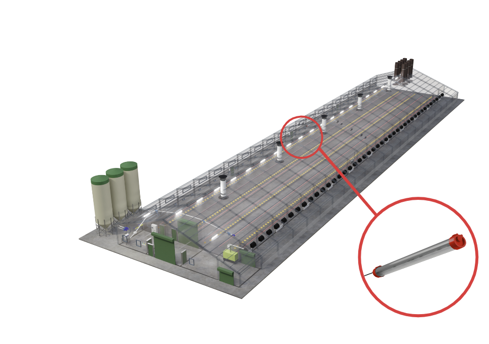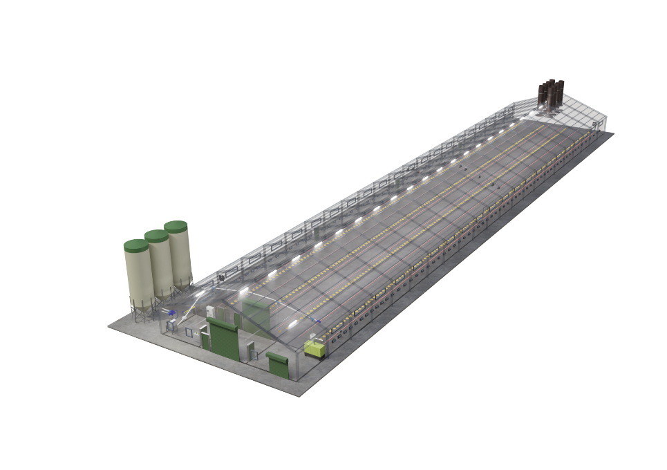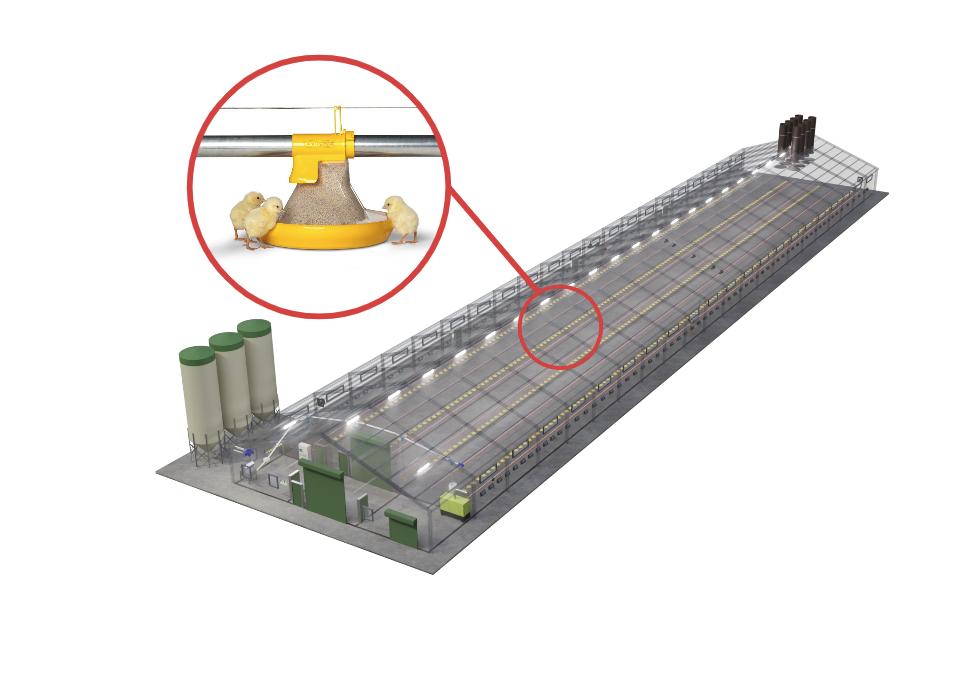 Unsere Fütterungsanlagen sind entscheidend für eine erfolgreiche Broilermast. Landmeco’s Futterschale bietet dank patentierter Lösungen optimale Futterverfügbarkeit. Die Futterlinien sind mithilfe elektrischer Hebemotoren höhenverstellbar. Hochwertige Silos gewährleisten hygienische Lagerung, und eine Futterwaage erfasst den Futterverbrauch präzise.